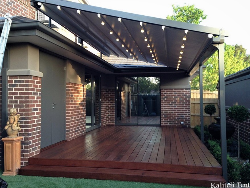 בפרגולות PVC חשמליות, כאשר הבד נמתח, הוא מאפשר למי הגשם לזרום החוצה. ניתן להתקין את המוצר על קיר או כמבנה עצמאי.